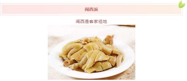 閩西菜以長(zhǎng)汀菜為代表,長(zhǎng)汀是中國(guó)客家菜之鄉(xiāng)。長(zhǎng)汀菜特別強(qiáng)調(diào)原汁原味,少用甚至不用味精;口味較清淡,湯清見底。烹飪以蒸、燉、釀、燜、煮為主;代表菜品有白斬河田雞、長(zhǎng)汀豆腐干、粉滑牛肉、汆豬腰等。